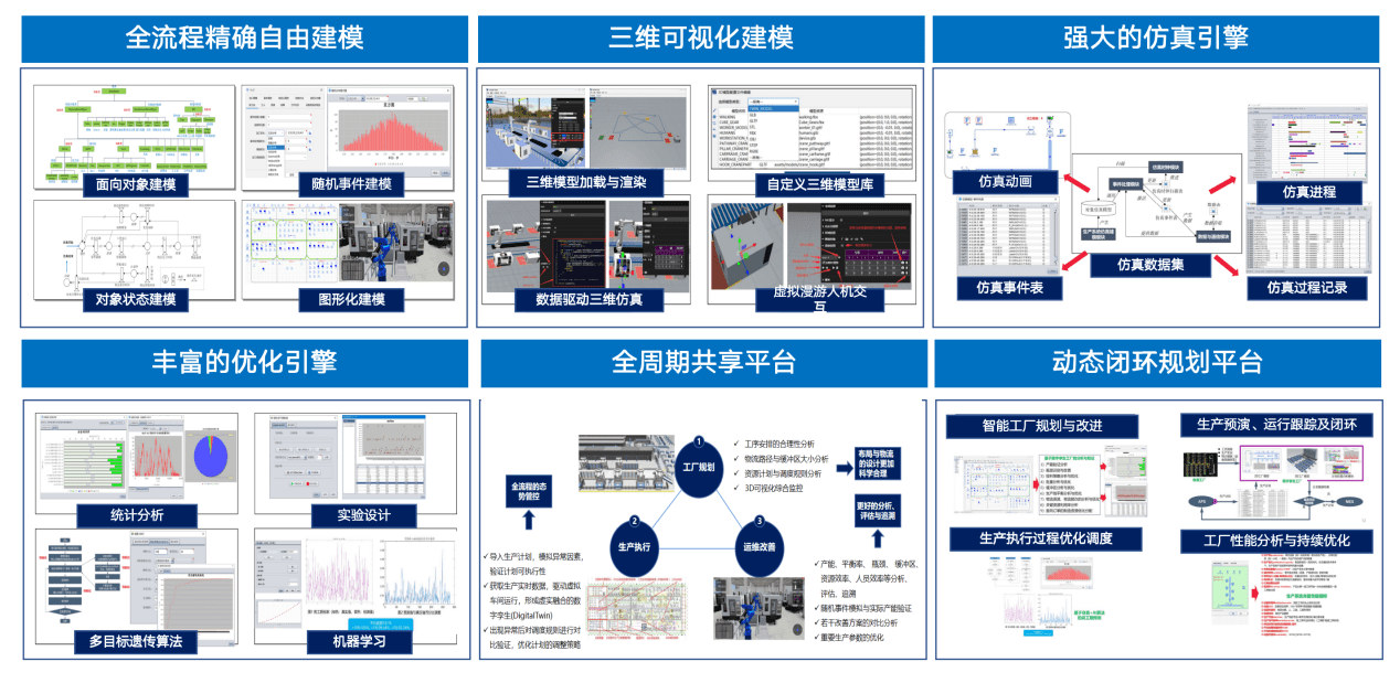 通过构建强大的建模引擎,支持车间全要素建模,包括结构、资源、数据、状态以及不确定事件等,实现三维建模能力,成为数字孪生工厂的基础仿真引擎;