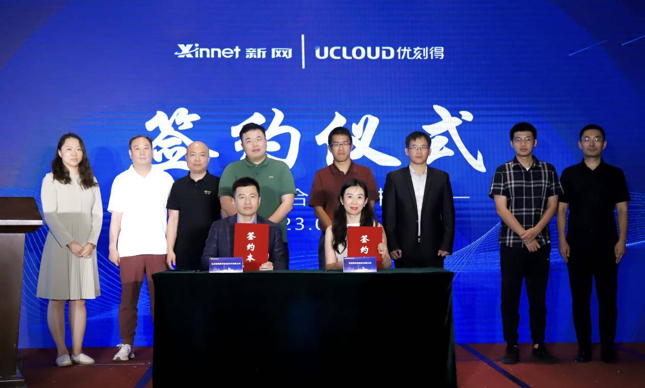 UCloud副总裁韩畅、新网CEO袁锋签署战略合作协议,UCloud计算产品线副总经理钟春山、新网副总经理杨晓东、新网产品高级总监吕玉龙等见证签约仪式。