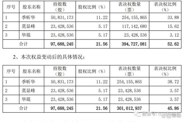 莫显峰离职后,季昕华持股11.22%,有33.88%投票权;莫显峰、华琨分别持股为5.17%,分别有3.12%的投票权;三人一共持有21.56%股权,及45.86%的投票权。