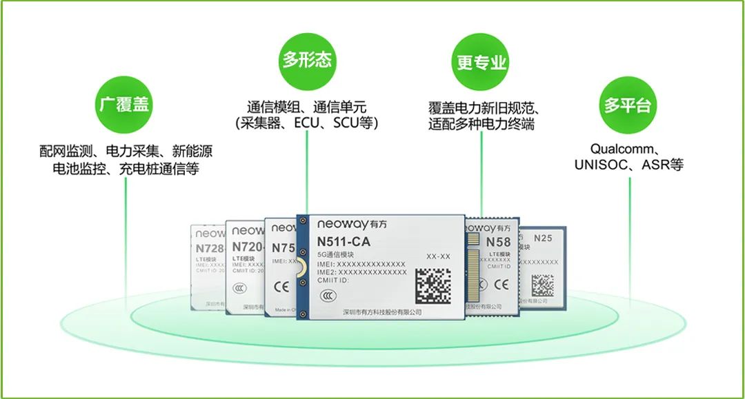 有方科技快速响应国网新规范要求,研发了覆盖5G、4G的无线通信模组及相应的通讯板等10余款产品。目前,部分产品已经批量出货,应用于适配新规范的国网I型、II型集中器、专变I型、III型采集器和能源控制器等电力计量终端,适用于各级电力/供电公司、公共建筑、居民小区等多维场景的数据集中采集与远程控制。