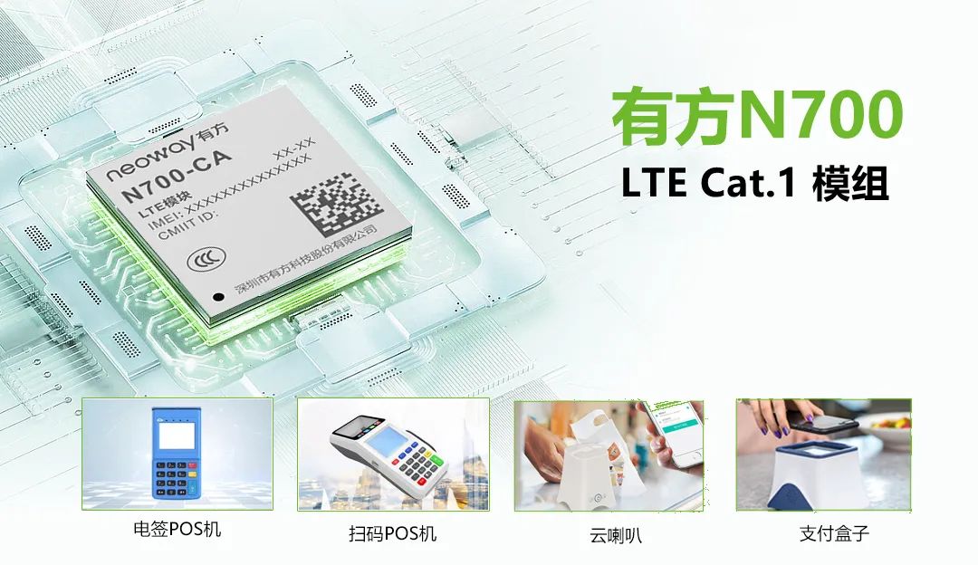 本次中标中国电信定制版模组产品招募的LTE Cat.1模组N700,是有方科技基于新一代芯片平台EC618推出的主要针对行业应用中超低功耗场景的Cat.1无线通信模组,以更小的尺寸、更优的设计方案满足使用过程中时效性强、便捷度高、安全性高的需求,目前已在云喇叭、电签POS、扫码POS、支付盒子等金融行业客户终端中得到完美应用。
