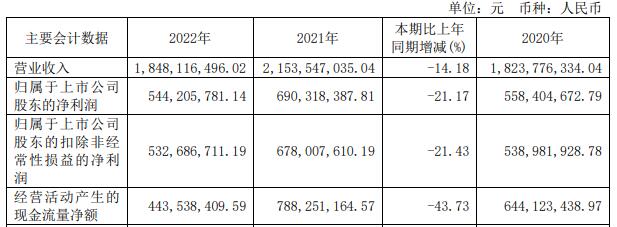 2022年,威高骨科实现营业收入18.48亿元,同比减少14.18%;归属于上市公司股东的净利润5.44亿元,同比减少21.17%;归属于上市公司股东的扣除非经常性损益的净利润5.33亿元,同比减少21.43%;经营活动产生的现金流量净额4.44亿元,同比减少43.73%。