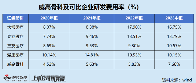 三是加码研发,推动创新成果转化,布局技术壁垒高,赛道尚不拥挤的非集采产品。而这就要求企业维持高水平的研发投入,加快产品迭代扩容。然而,从研发费用率看,威高骨科的投入力度同样处于行业尾部。