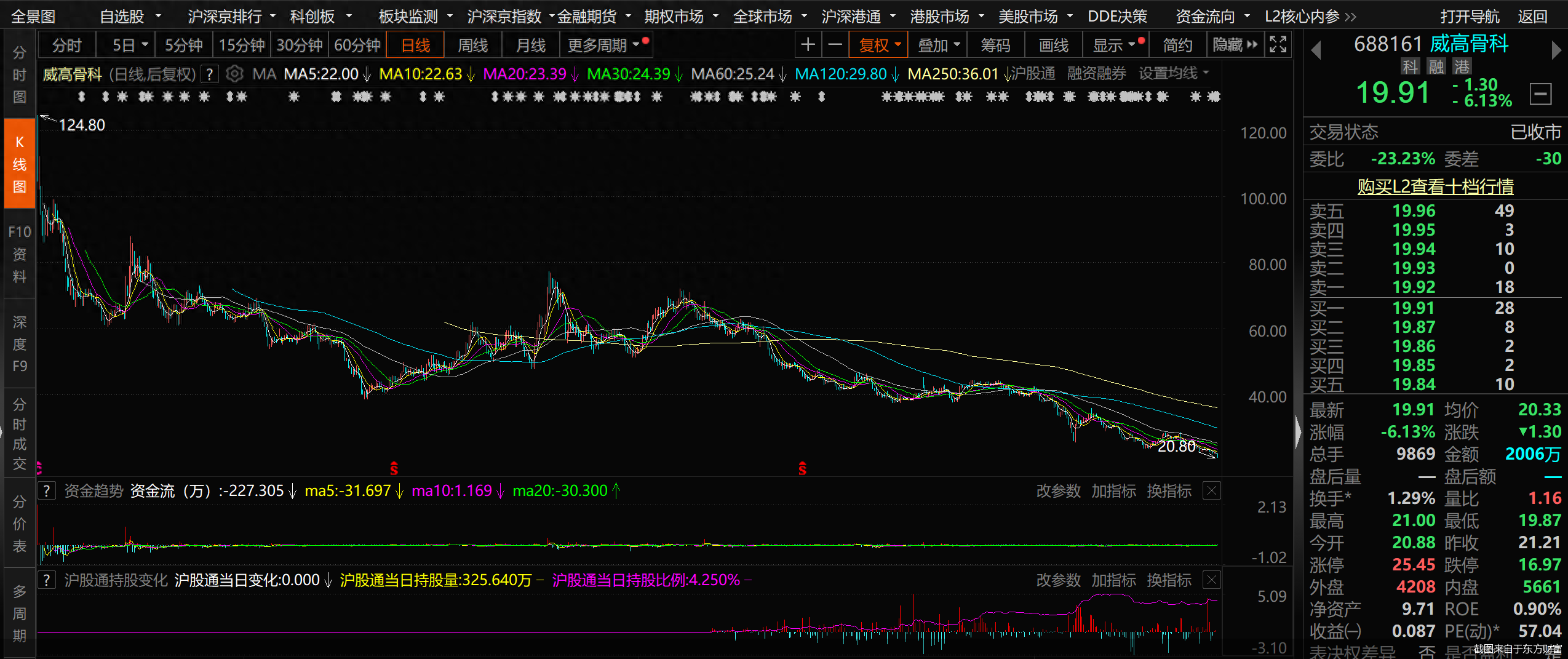 6月24日,威高骨科股价大跌逾6%,盘中再度创下股价历史新低。
