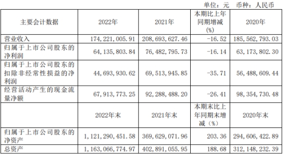 赛伦生物2022年营业收入为1.74亿元,同比下降16.52%;归属于上市公司股东的净利润为6413.58万元,同比下降16.14%;归属于上市公司股东的扣除非经常性损益的净利润为4469.39万元,同比下降35.71%;经营活动产生的现金流量净额为6791.38万元,同比减少26.41%。