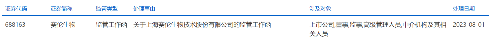 8月2日讯上交所网站昨日披露关于上海赛伦生物技术股份有限公司(股票简称:赛伦生物,688163.SH)的监管工作函,涉及对象为上市公司、董事、监事、级管理人员、中介机构及其相关人员。