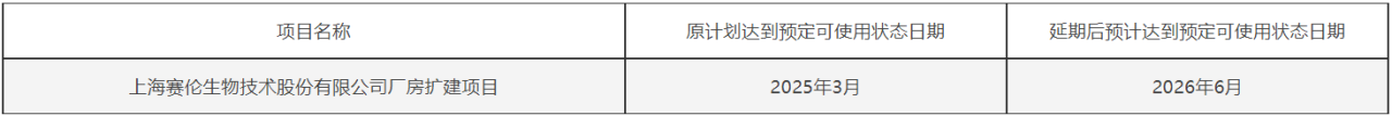 9月29日,赛伦生物发布公告,该公司计划对募投项目“上海赛伦生物技术股份有限公司厂房扩建项目”达到预定可使用状态的时间进行延期。上述项目的原计划达到预定可使用状态日期为2025年3月,延期后预计达到预定可使用状态日期为2026年6月。