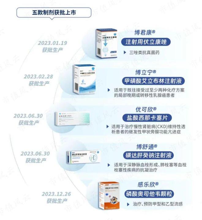 2023年,博瑞医药共有5款制剂获批上市,阿加曲班注射液、磷酸奥司他韦干混悬剂也在第八批全国药品集中采购中拟中标。2024年第一季度,取得卡前列素氨丁三醇注射液药品注册证书。