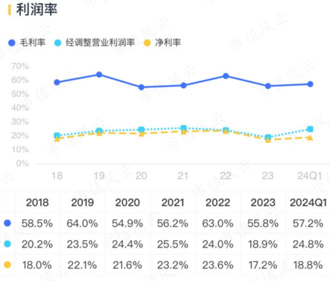 打开市值风云F10上线的财务分析图表,我们一眼就能看出来:公司2023年净利润下滑首要原因是毛利率,虽然55.8%的毛利率属于正常波动区间,但明显是历史低分位值;毛利率同比减少7.2个百分点,毛利总额与去年基本持平。