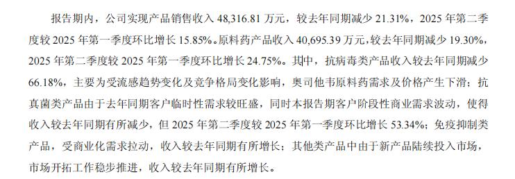 收入结构上,公司高度依赖原料药业务。2025年上半年,该板块实现收入4.07亿元,占产品销售收入总额的84.23%。其中,核心产品磷酸奥司他韦原料药因被纳入带量采购,抗病毒类产品销售收入同比骤降66.2%,成为拖累整体营收的主要因素。