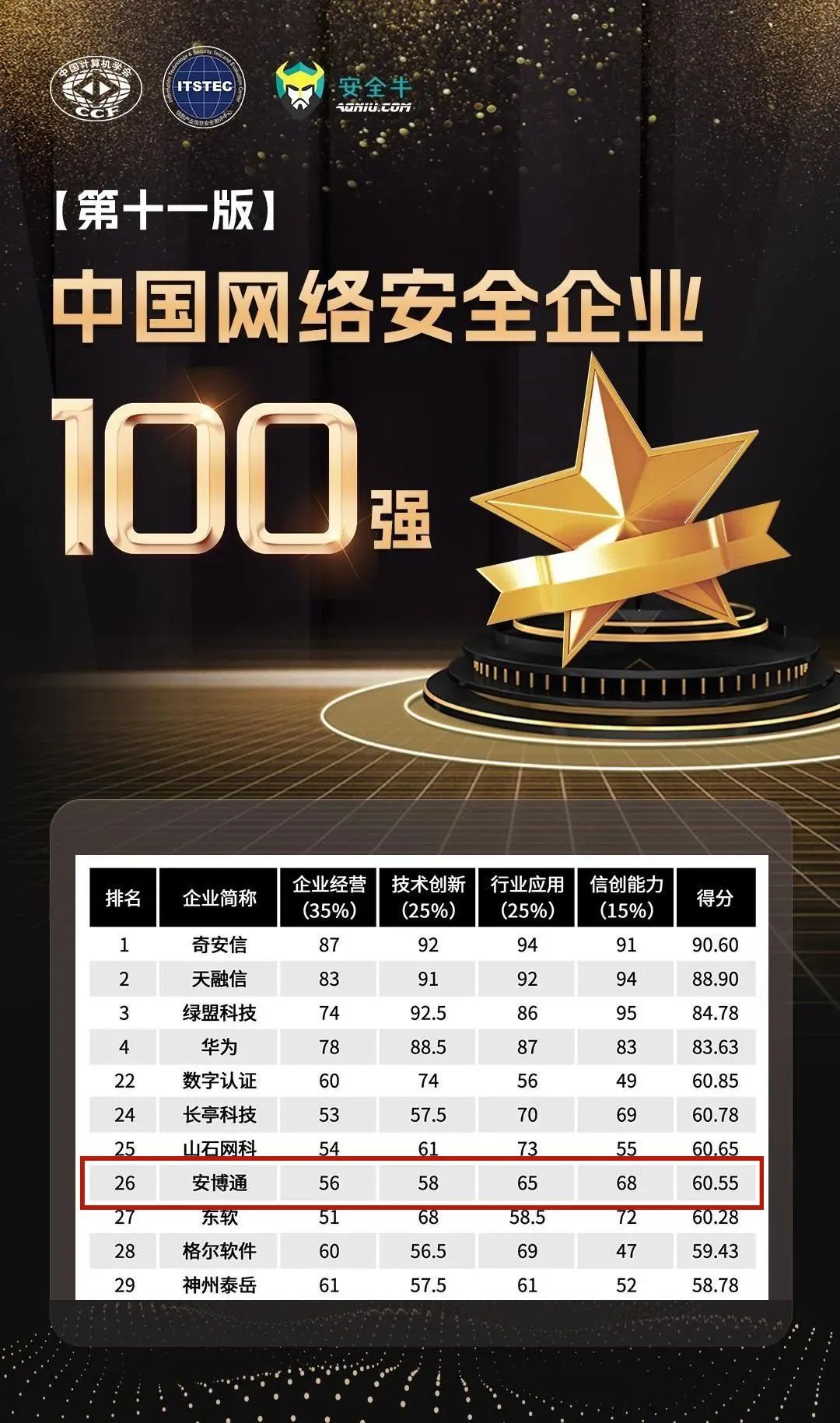 2023年12月,中国计算机学会抗恶劣环境计算机专业委员会、信息产业信息安全测评中心、安全牛联合发布第十一版《中国网络安全企业100强》(以下简称“100强”),安博通八度入选榜单,此次综合排名第26位。