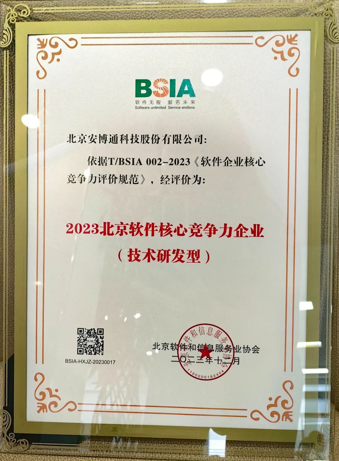12月12日,北京软件和信息服务业协会(简称“北京软协”)第十一届会员代表大会第一次会议暨第十一届理事会第一次会议期间,北京软协副会长费振勇发布《2023北京软件企业核心竞争力评价报告》。安博通凭借过硬的技术实力及综合竞争力入选“北京软件核心竞争力企业(技术研发型)”。