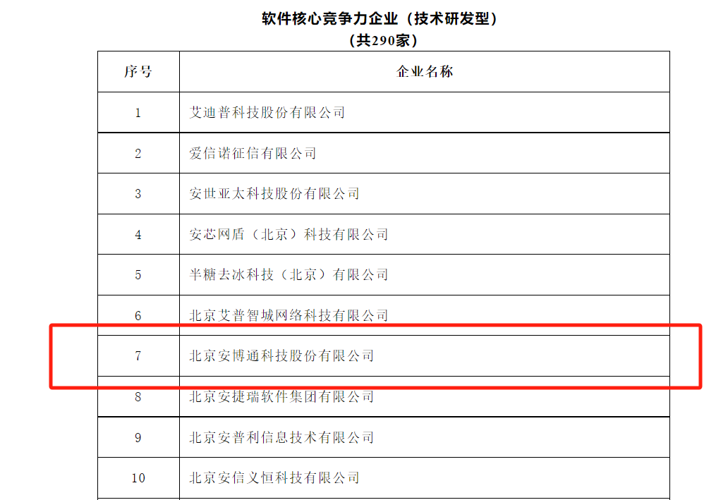 “2023北京软件核心竞争力企业”以软件企业的综合素质为基本要求,以产业带动力、技术创新力、市场影响力、业务前瞻性为核心要素,从软件企业的企业规模、经营业绩、研发能力、创新成果、质量保证等方面进行评价。安博通三度入选“北京软件核心竞争力企业”,展现出公司在软件市场应用中的优秀发展潜力和强劲竞争力。