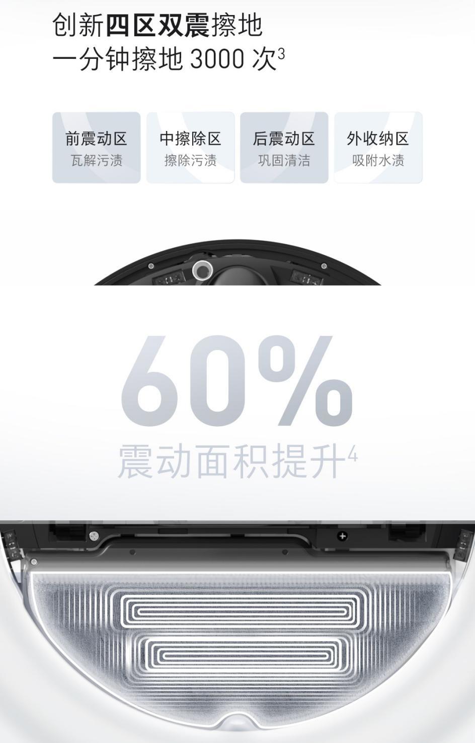 石头科技表示,自清洁扫拖机器人 G20 搭载了超能双驱模组,将扫拖功能进行架构整合升级,带来双螺旋胶刷、四区双震擦地功能,实现了更进一步的清洁效果。