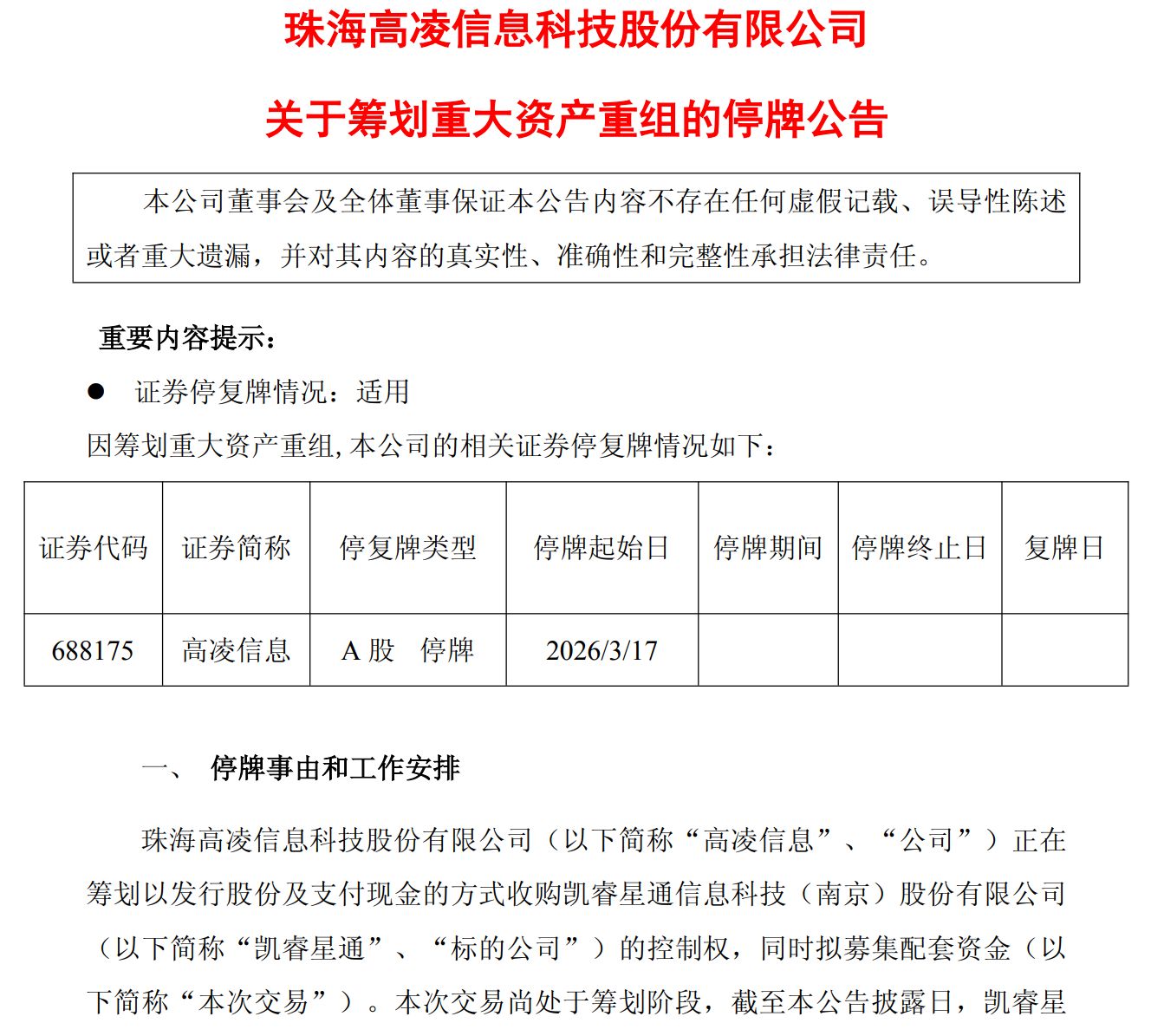 3月16日晚间,高凌信息(SH688175,股价35.45元,市值45.84亿元)公告称,公司正在筹划以发行股份及支付现金的方式收购凯睿星通的控制权,同时拟募集配套资金。经初步测算,本次交易预计构成重大资产重组,高凌信息股票将自3月17日起停牌。
