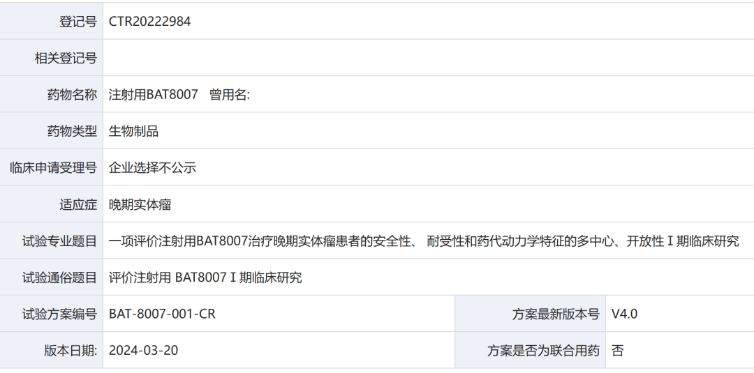 本项临床I期研究于2023年2月完成首例受试者入组,旨在评价BAT8007治疗晚期实体瘤患者的安全性、耐受性和药代动力学特征,目标入组人群250例,已经完成93例患者入组。