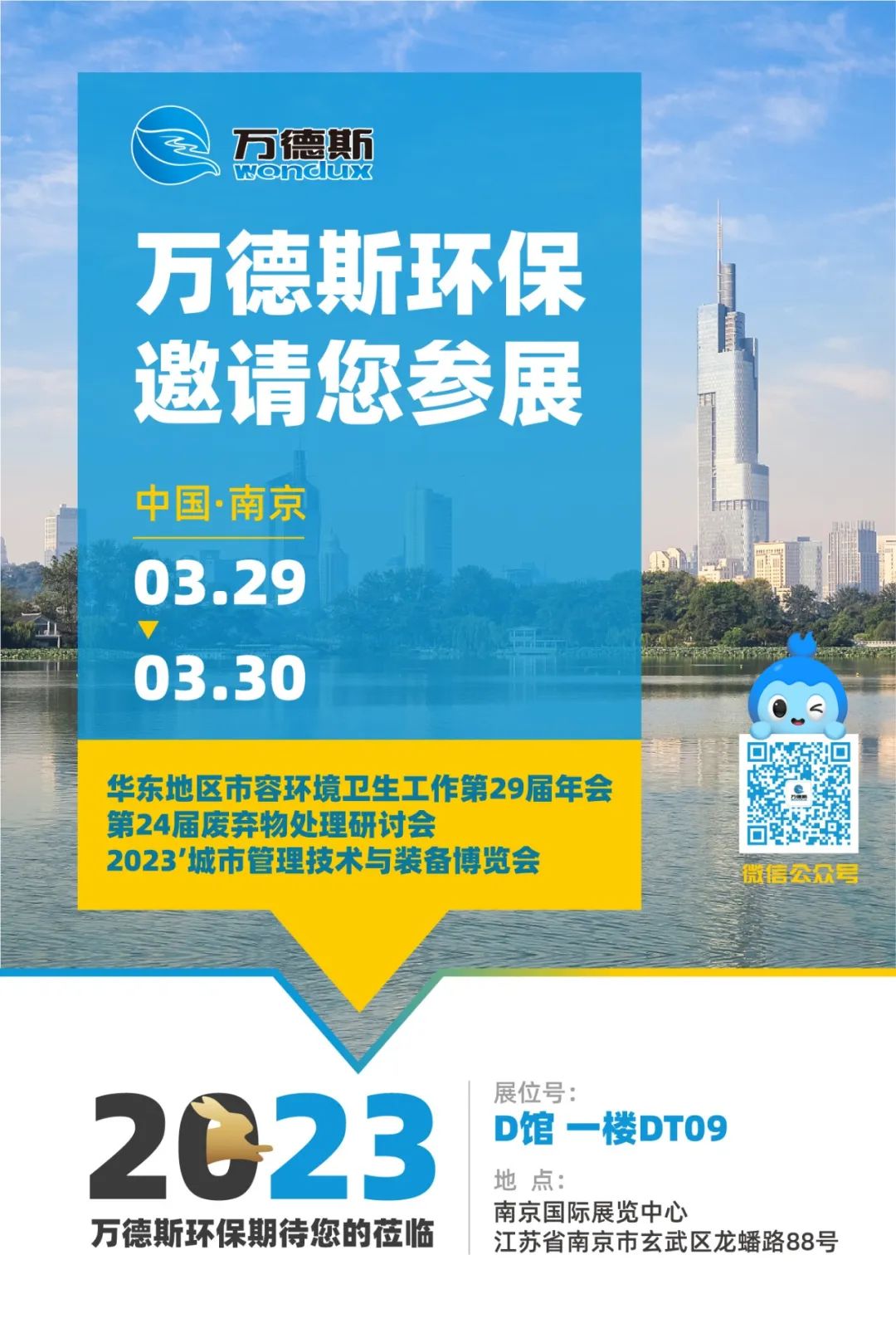 华东地区市容环境卫生工作第29届年会暨第24届废弃物处理研讨会、2023城市管理技术与装备博览会(以下简称第29届华东环卫年会)定档2023年3月28-30日,在南京国际展览中心举办!万德斯环保受邀参展!