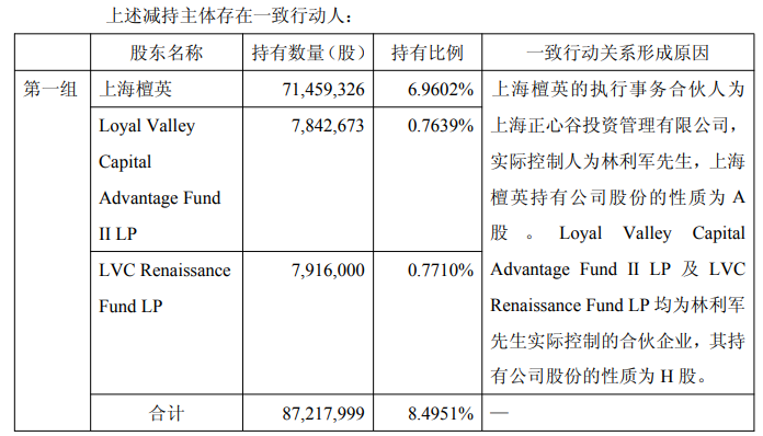 上海檀英的执行事务合伙人为上海正心谷投资管理有限公司,实际控制人为林利军,上海檀英持有公司股份的性质为A股。Loya lValley Capital Advantage FundII LP及LVC Renaissance Fund LP均为林利军实际控制的合伙企业,其持有公司股份的性质为H股。