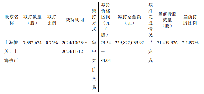 2024年10月23日至2024年11月12日,上海檀英、上海檀正投资合伙企业(有限合伙)(以下简称“上海檀正”)减持君实生物7,392,674股,减持比例为0.75%,减持价格区间为29.54元/股至34.04元/股,减持总金额为2.30亿元。