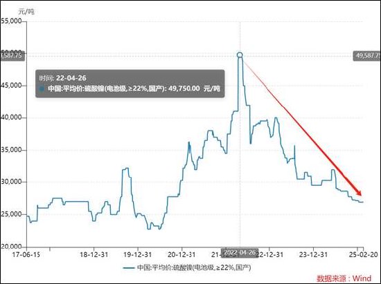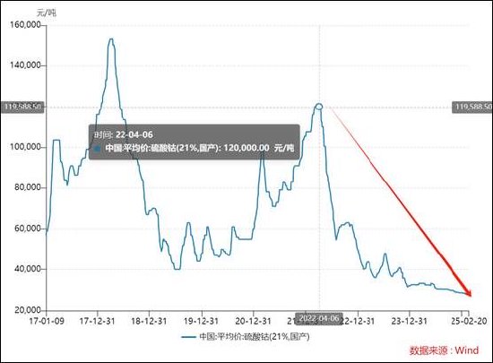与此同时,硫酸钴、硫酸镍、硫酸锰等原材料价格出现大幅下跌。其中以硫酸钴由2022年4月的12万元/吨骤降至年底的5万元/吨左右,降幅接近60%,目前硫酸钴均价为2.8万/吨左右。