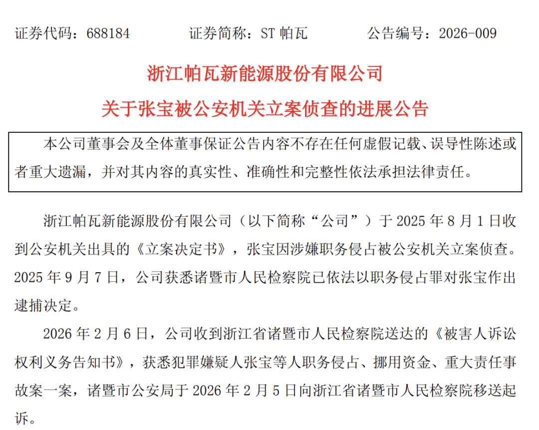 2月6日晚间,ST帕瓦(688184.SH)公告称,公司于当日收到浙江省诸暨市人民检察院(下称“诸暨检察院”)送达的《被害人诉讼权利义务告知书》,获悉犯罪嫌疑人张宝等人职务侵占、挪用资金、重大责任事故案一案,诸暨市公安局于2月5日向诸暨检察院移送起诉。
