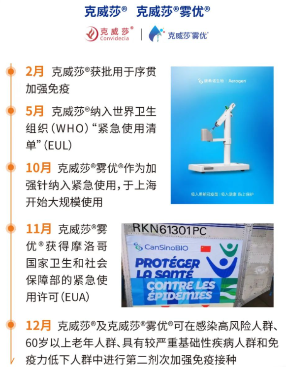 全球创新吸入用新冠疫苗获批大规模使用。全球首款吸入用新冠疫苗克威莎雾优,经国家卫生健康委提出建议,国家药品监督管理局组织论证同意作为加强针纳入紧急使用。2022年10月,克威莎雾优在上海等地开始接种,目前已在中国开展大规模接种工作,开启了创新型技术路线新冠疫苗用于加强免疫接种的新进程。