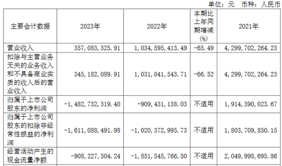 2023年年报显示,去年,公司实现营业收入3.57亿元,同比下降65.49%;归母净利润-14.83亿元,上年同期为-9.09亿元;扣非净利润-16.11亿元,上年同期为-10.20亿元;经营活动产生的现金流量净额为-9.08亿元,上年同期为-18.52亿元。