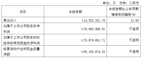 2024年第一季度,公司实现营业收入1.14亿元,同比增长13.65%;归母净利润-1.70亿元;扣非净利润-1.79亿元;经营活动产生的现金流量净额为-1.08亿元。
