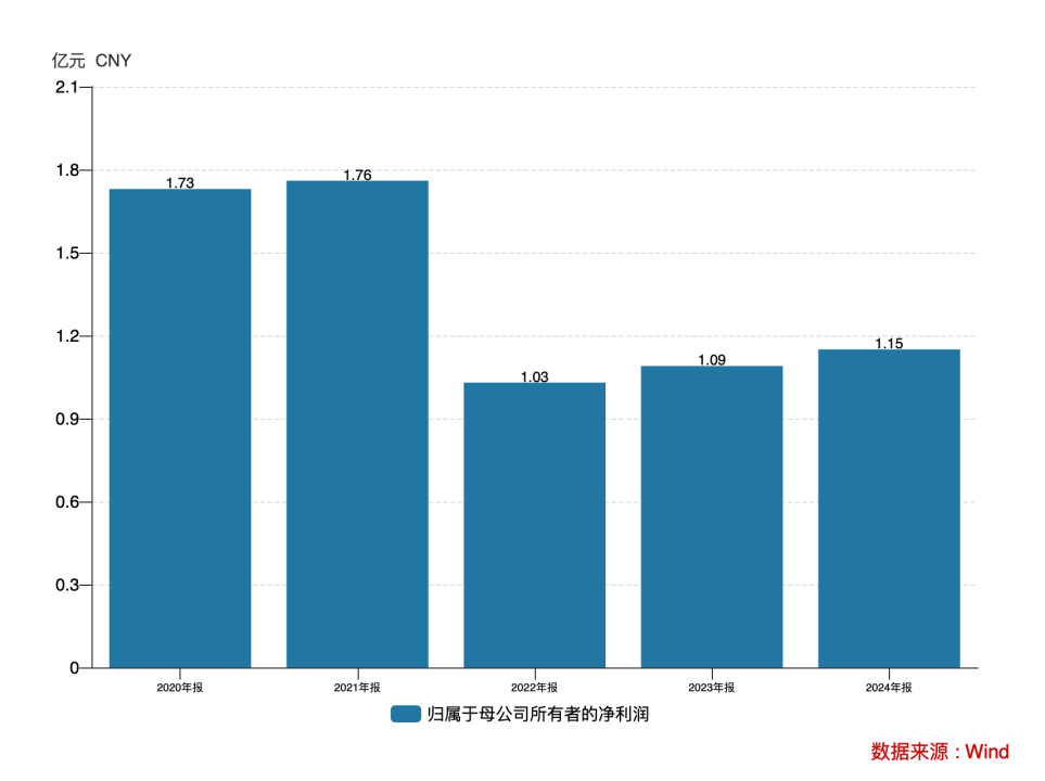 2020-2024年的归母净利润分别为1.73亿元、1.76亿元,1.03亿元、1.09亿元和1.15亿元,自从2022年断档下滑之后的三年均未见盈利回复,这也让公司股价一度从2021年9月份的高点一路下滑,市值蒸发一度接近九成。