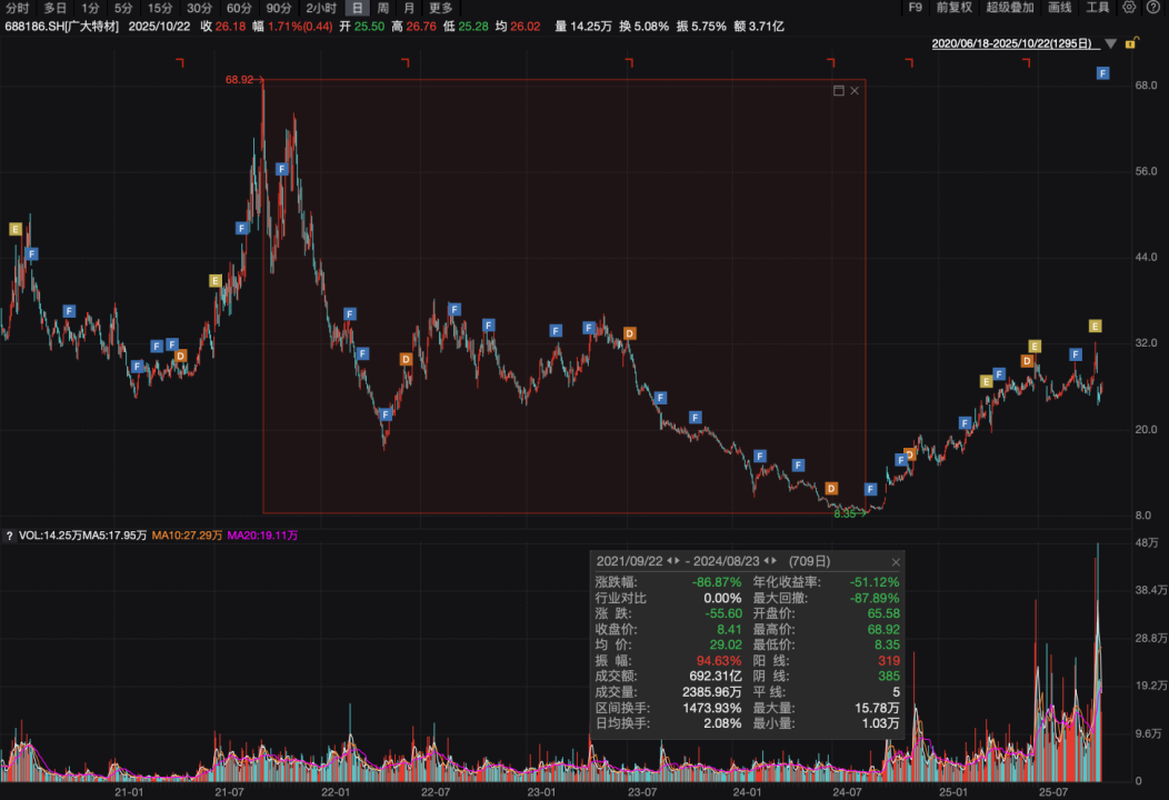 虽然公司在2025年10月18日发布了徐卫明解除留置的公告,但是已然引发市场资金的担忧,看空情绪持续发酵,因为在过去的一年时间里,广大特材市值涨幅已经逼近260%了。
