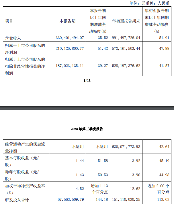 根据柏楚电子的三季报,第三季度,柏楚电子实现营业收入3.30亿元,同比增加35.52%;归属于上市公司股东的净利润为2.10亿元,同比增加51.42%;