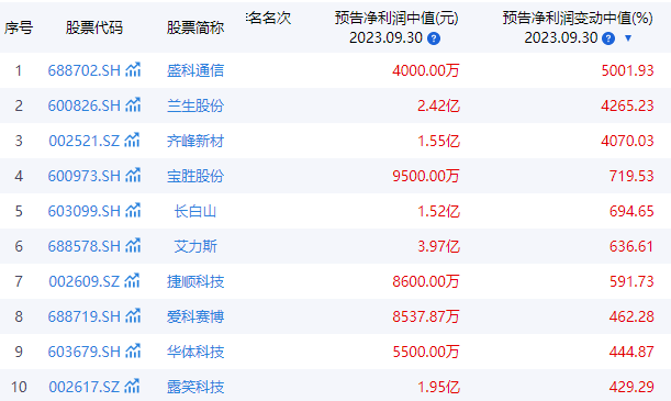 在净利润增幅方面,144家公司中,82家公司净利润同比增幅中值超30%,31家公司净利润中值翻倍增长。仅有13家公司净利润中值增幅为负值。净利润同比增幅排名靠前的公司有盛科通信、兰生股份、养峰新材、宝胜股份、长白山、艾力斯等,其中盛科通信净利润中值同比增长超50倍。