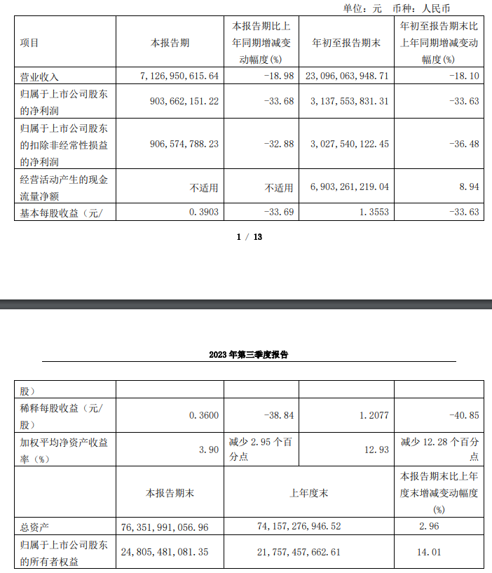 10月10日盘后,平煤股份成为第二家披露2023年三季报的上市公司。报告显示,前三季度,公司实现营业收入230.96亿元,同比下降18.10%;归属于上市公司股东的净利润31.38亿元,同比下降33.63%;归属于上市公司股东的扣非净利润30.28亿元,同比下降36.48%。