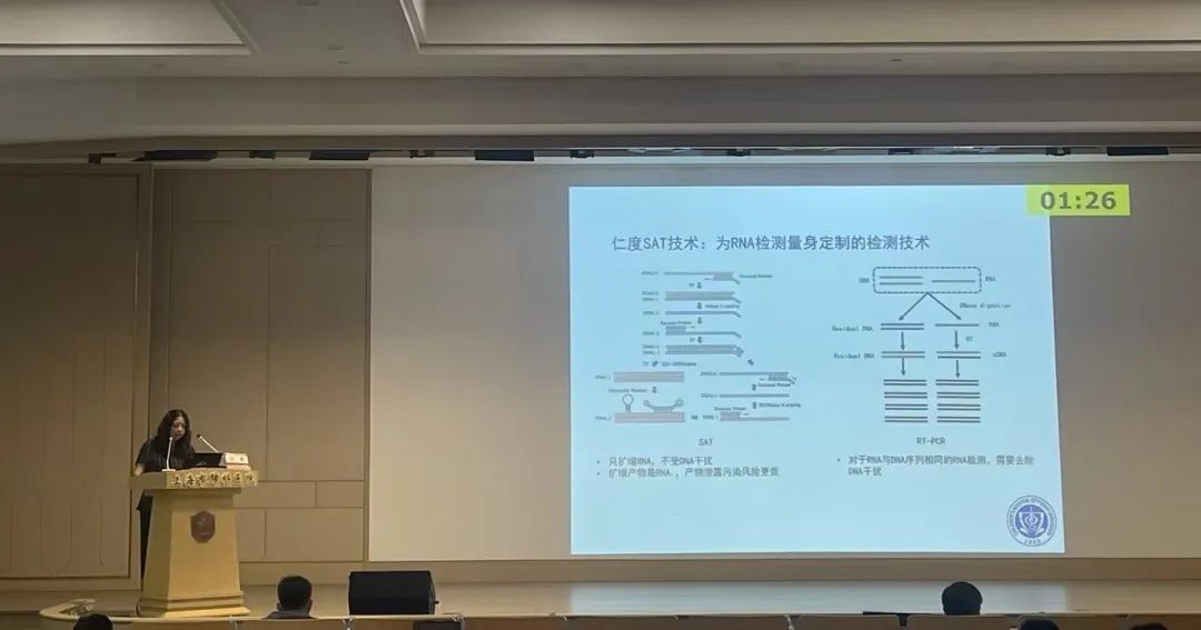 来自复旦大学附属儿科医院的临床检验中心主任徐锦教授针对目前呼吸道病原体诊断的技术做了一些分享,其中提到RNA是目前感染领域更好的诊断靶标,具有易降解和多拷贝数的特点,肯定其及时反映疗效以及灵敏度高的优势,并且详细介绍了基于RNA分子的专利平台:实时荧光恒温扩增检测技术(SAT)的具体检测原理,以及RNA在感染领域中的相关应用,强调其具有DNA不可替代的价值
