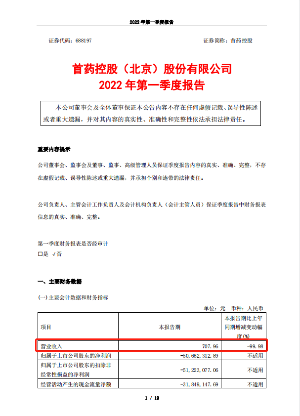 近日,上市企业首药控股(688197.SH,首药控股(北京)股份有限公司)最新披露的一季度财报中显示,公司营收仅有707.96元,同比下降99.98%,净利润亏损5066.23万元。该消息一出不胫而走,引来各路吃瓜群众围观,更有网友戏谑:“还没有我的工资高。”