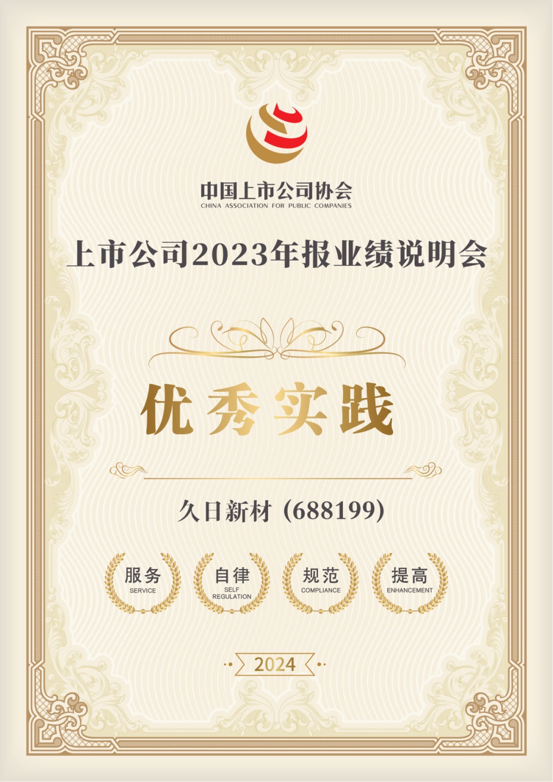 为深入贯彻新“国九条”中提出的“金融为民”理念,坚持以人民为中心的发展思想,有效保护投资者的合法权益,切实提升上市公司投资者关系管理水平,中国上市公司协会自2021年起开展上市公司年报业绩说明会最佳实践评估工作。公司凭借与投资者的积极互动,获评“上市公司2023年报业绩说明会优秀实践”。