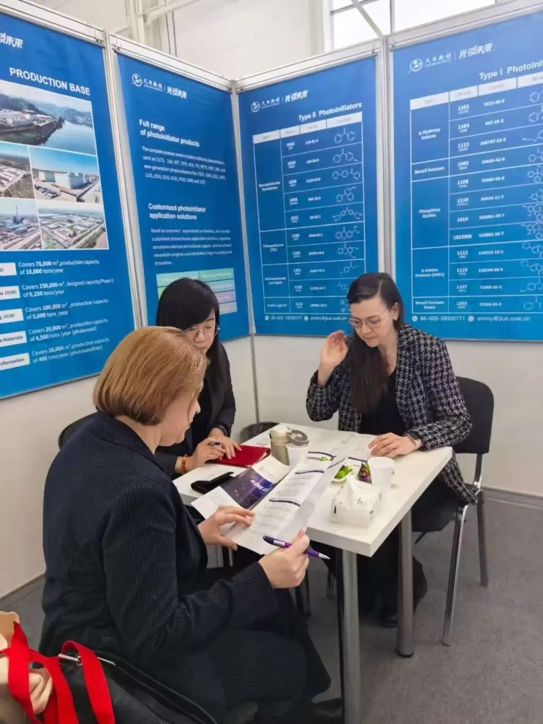 展会期间,久日新材技术团队与来访客户深入交流,针对俄罗斯客户普遍关心的低温固化效率、低迁移需求等实际生产痛点,技术人员结合具体应用场景,进行了深入的技术探讨与产品方案推演。许多客户在现场仔细翻阅产品手册、深入了解应用案例后,对公司的产品稳定性和供应能力给予高度认可,并表达了明确的合作意向。