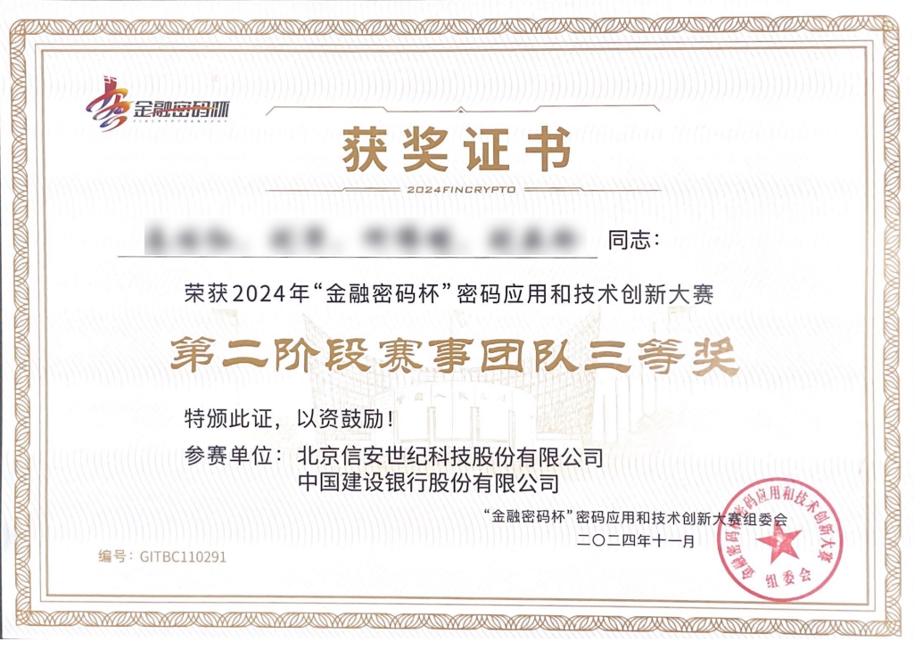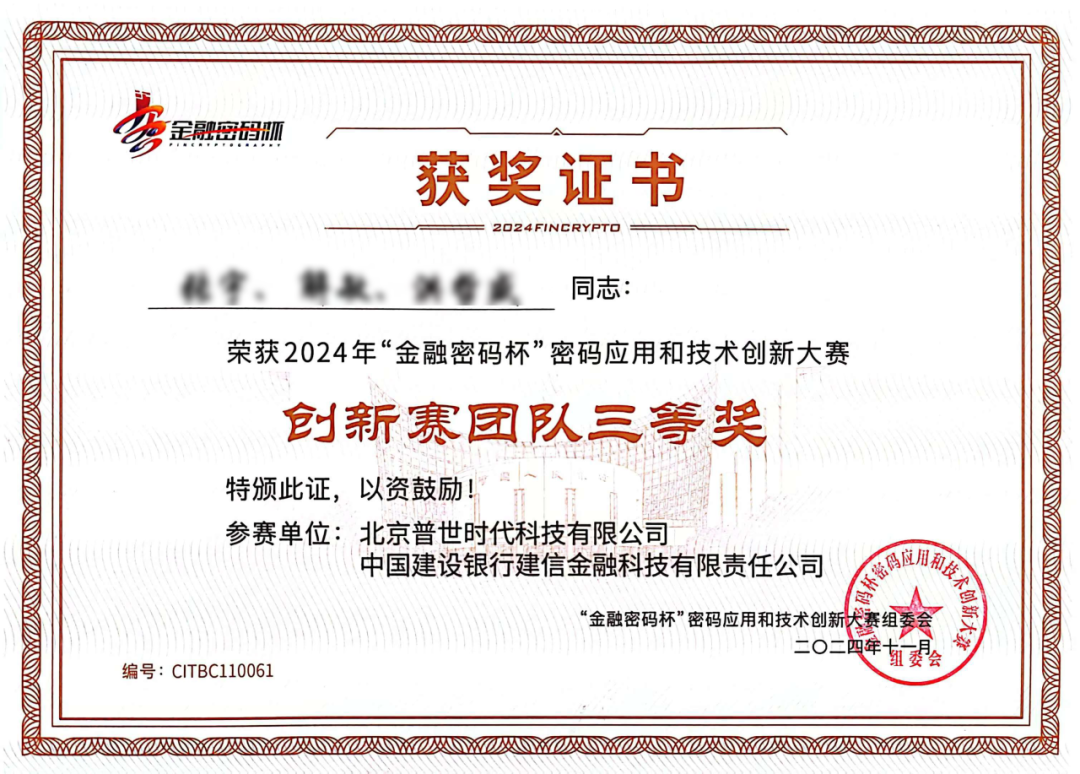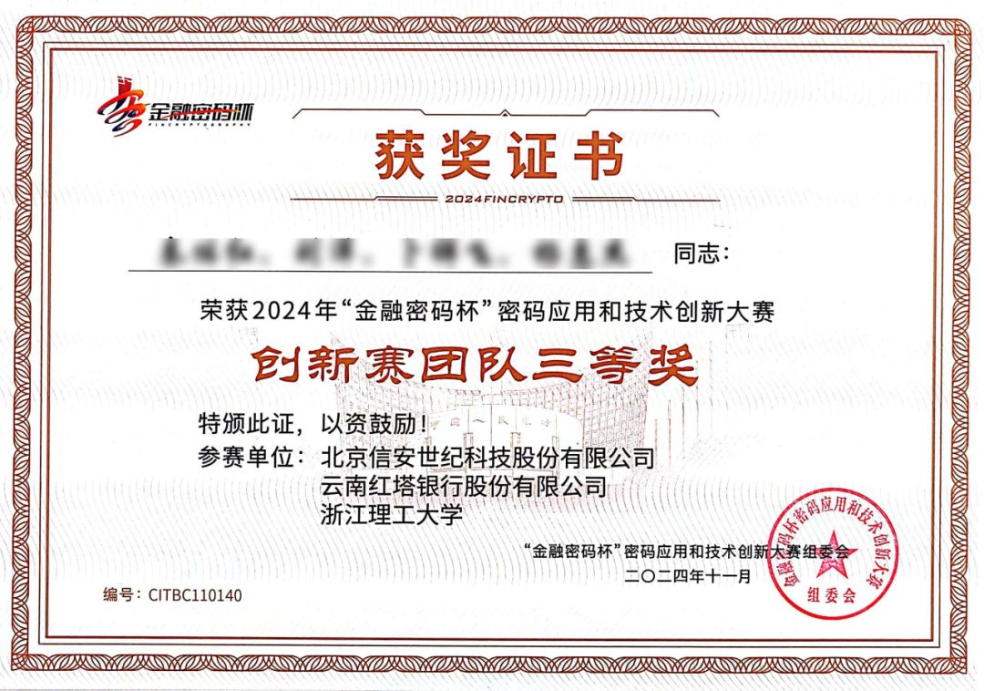 ●《面向金融应用的后量子密码迁移研究》:创新赛团队三等奖