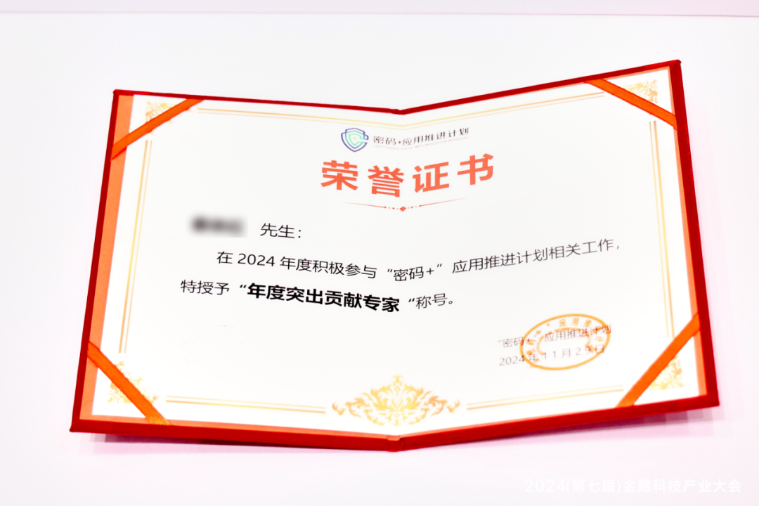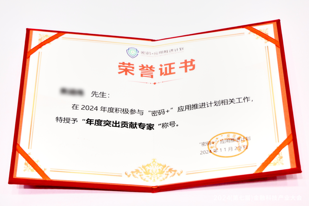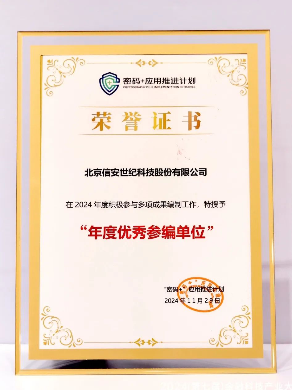 11月29日,以“数慧金融,质引科技”为主题的2024(第七届)金融科技产业大会在北京盛大召开。会上,对积极参与“密码+”应用推进计划的单位和个人进行了表彰。北京信安世纪科技股份有限公司(股票代码:688201)凭借在2024年度对多项成果编制工作的积极贡献,荣获“年度优秀参编单位”称号,信息安全研究院两位专家被授予“年度突出贡献专家”称号。