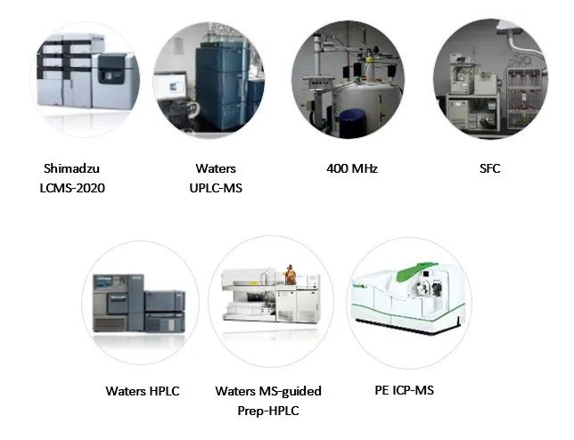 美迪西化学部设备齐全,主要的仪器包括UPLC, HPLC, LC-MS, GC-MS, GC, IC, SFC, prep-HPLC, MS directed Prep-HPLC, LC-MS-MS等色谱分析仪,Biotag微波反应器,高配置semi-auto-chromatography system,Lyophilyzer,差示扫描量热仪(DSC),热重分析仪(TGA),X射线粉末衍射(XRPD),粒度测定仪(PSD),偏光显微镜(Polarized light microscopy),核磁共振(NMR),傅里叶转换红外光谱(FT-IR),水份仪(KF),紫外及可见光谱(UV-Vis),旋光仪(Polarimeter),ICP-MS,NMR核磁共振,HPLC高效液相色谱,SFC 超临界流体色谱仪,MS定向制备HPLC,微波反应器,DSC差示扫描量热仪,TGA热重分析仪,ICP-MS电感耦合等离子体-质谱等。