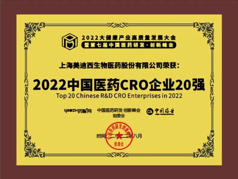 上海美迪西生物医药股份有限公司(以下简称“美迪西”)作为国内少有的一站式生物医药临床前研发服务平台,凭借扎实的研发实力,再次入选“2022中国医药CRO企业20强”,这已是美迪西连续3年获此荣誉称号!
