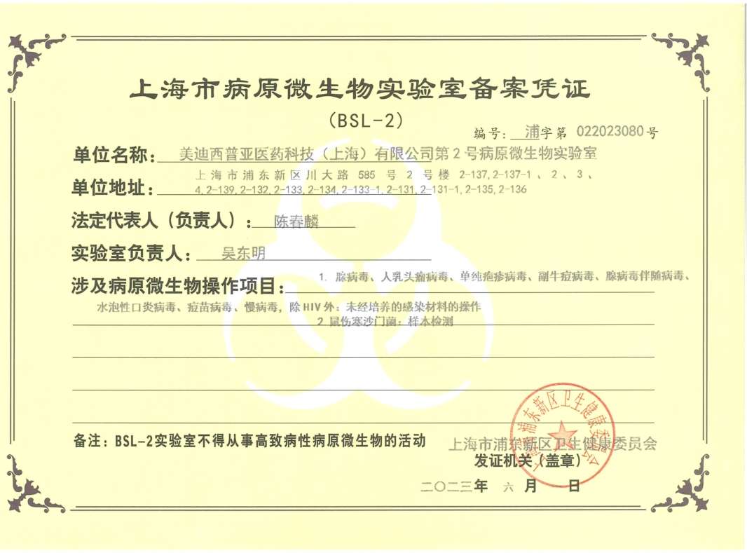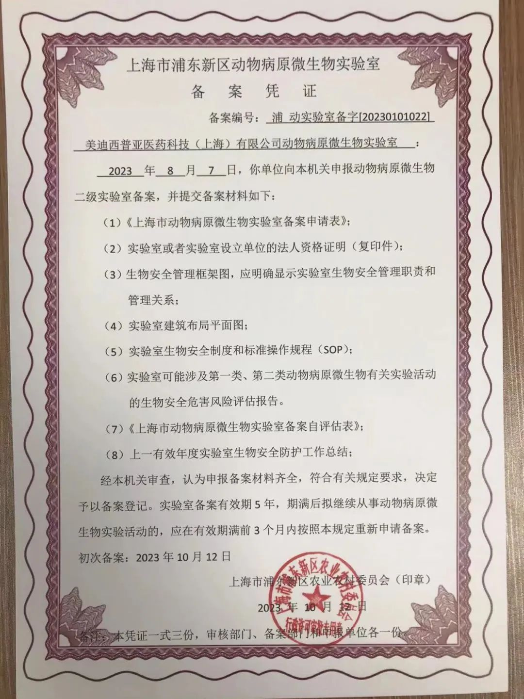 ABSL-2实验室取得上海市浦东新区农业农村委员会颁发的《上海市浦东新区动物病原微生物实验室备案凭证》,成为同时拥有ABSL-2和BSL-2实验室的一站式生物医药临床前研发服务平台!