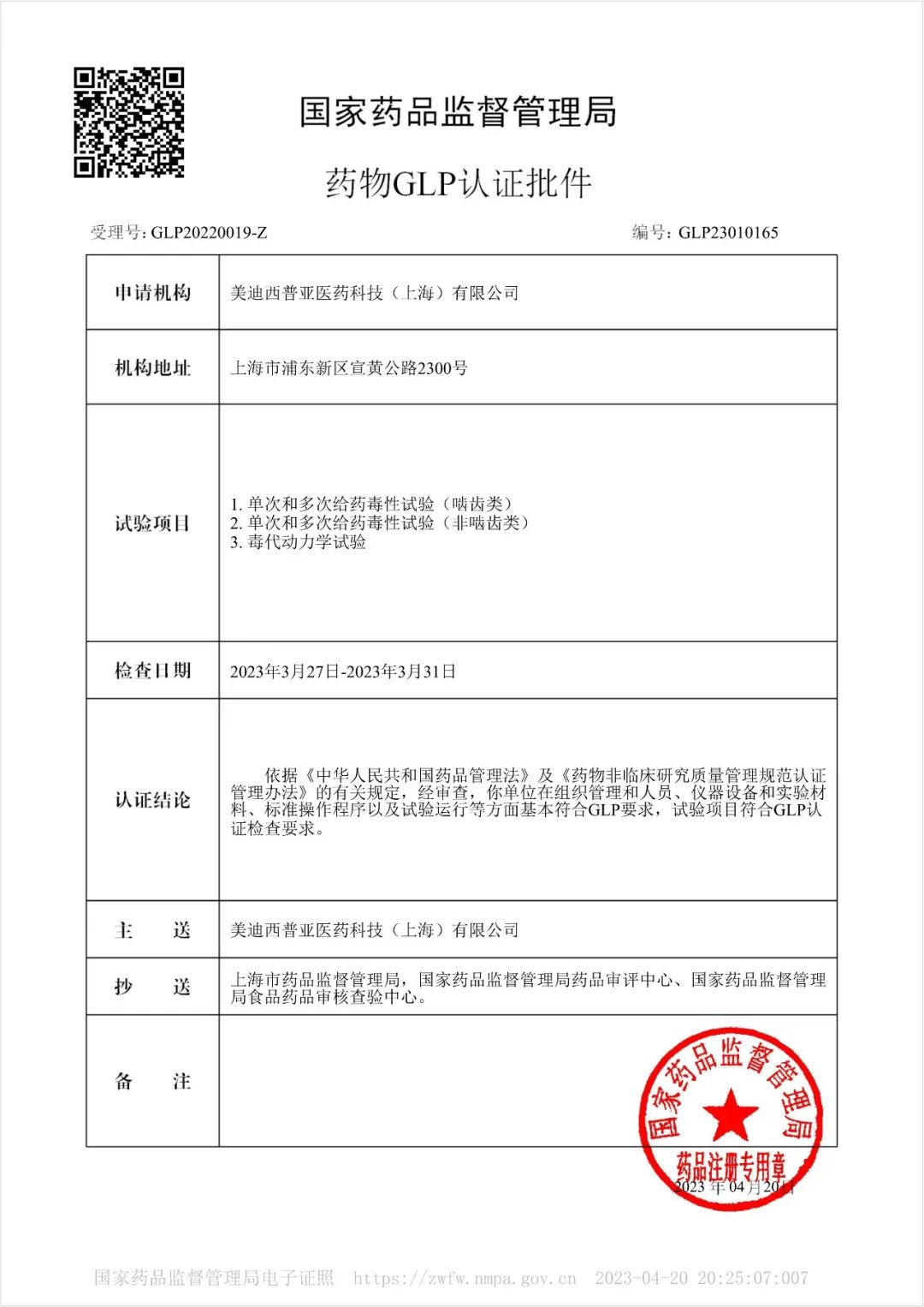 为及时响应研发需求,美迪西新增实验设施获得国家药品监督管理局GLP认证资质,GLP服务范围从8项增加到9项,GLP实验室面积从1.1万平方米增加到2.9万平方米。