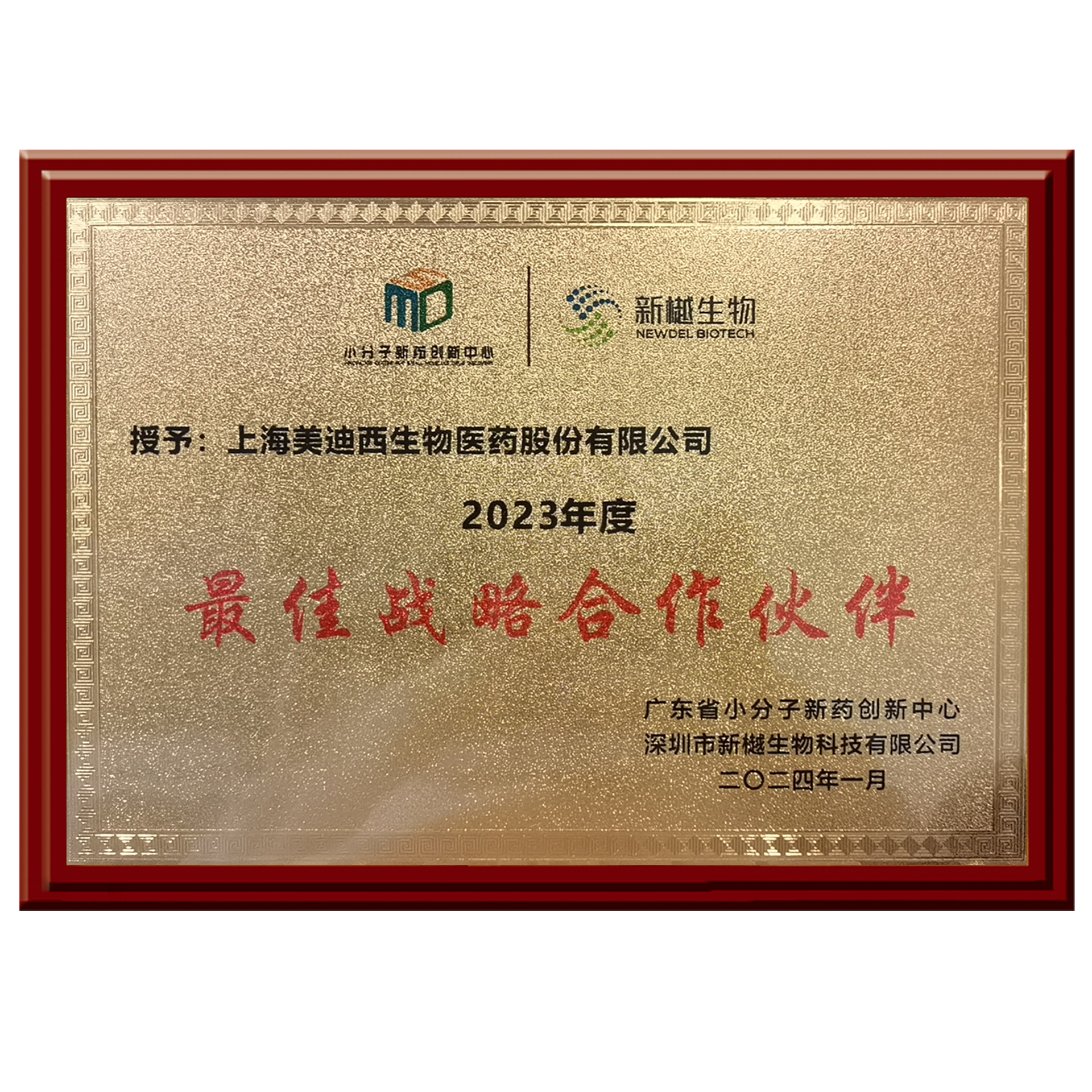 此次荣获2023年度“最佳战略合作伙伴”奖,既是新樾生物对美迪西研发服务的高度认可,也是对未来深入合作与发展的鼓励与期许。荣誉加冕,倍感荣幸,美迪西将持续创新药物研发服务平台,助力新樾生物成为国际领先、特色鲜明的新药研发型生物制药公司,助力全球创新药物研发。