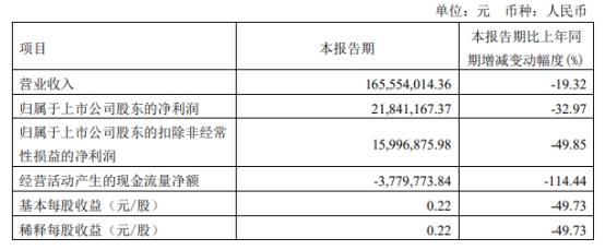 德科立2023年第一季度营业收入为1.66亿元,变动比例为-19.32%;归属于上市公司股东的净利润2184.12万元,变动比例为-32.97%;归属于上市公司股东的扣除非经常性损益的净利润为1599.69万元,变动比例为-49.85%;经营活动产生的现金流量净额为-377.98万元,变动比例为-114.44%。