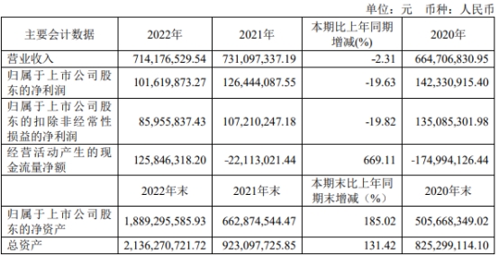 德科立2022年营业收入为7.14亿元,同比下降2.31%;归属于上市公司股东的净利润为1.02亿元,同比下降19.63%;归属于上市公司股东的扣除非经常性损益的净利润为8595.58万元,同比下降19.82%;经营活动产生的现金流量净额为1.26亿元,上年同期为-2211.30万元。