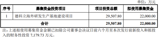德科立2023年7月26日披露以简易程序向特定对象发行股票募集说明书(申报稿),公司本次向特定对象发行股票的募集资金总额为22,000.00万元,不超过三亿元且不超过最近一年末公司净资产的20%,扣除发行费用后的净额将全部用于德科立海外研发生产基地建设项目。