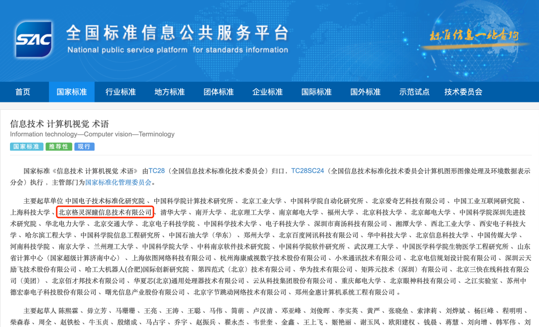 近日,《信息技术计算机视觉术语》国家标准发布(标准号GB/T41864-2022),这是我国在人工智能领域发布的第一批国家标准之一。格灵深瞳作为主要起草单位,参与了该国家标准的起草工作。