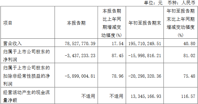格灵深瞳(688207.SH)日前披露的2022年第三季度报告显示,年初至报告期末,该公司实现营业收入1.96亿元,同比增长40.80%;实现归属于上市公司股东的净利润-1599.88万元,同比增长81.02%;实现归属于上市公司股东的扣除非经常性损益的净利润-2029.83万元,同比增长75.48%;经营活动产生的现金流量净额1334.52万元,同比增长116.57%。