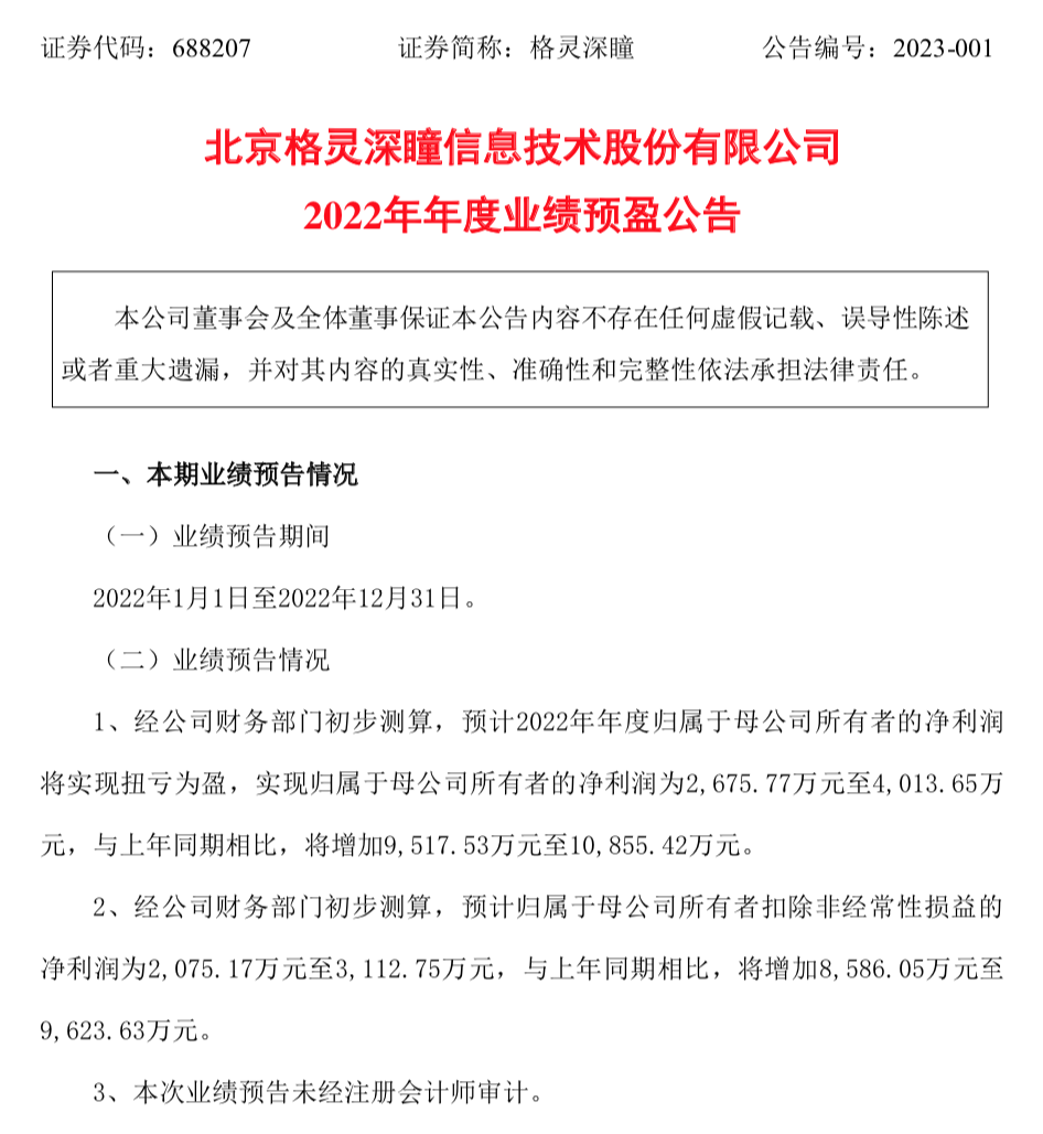 春节假期刚刚结束,AI上市公司格灵深瞳就发布了2022年的业绩预盈公告。公告内容显示,格灵深瞳2022年全年预计实现净利润2,675.77万元至4,013.65万元。这意味着,格灵深瞳成为了国内第一家实现盈利的AI视觉上市公司。